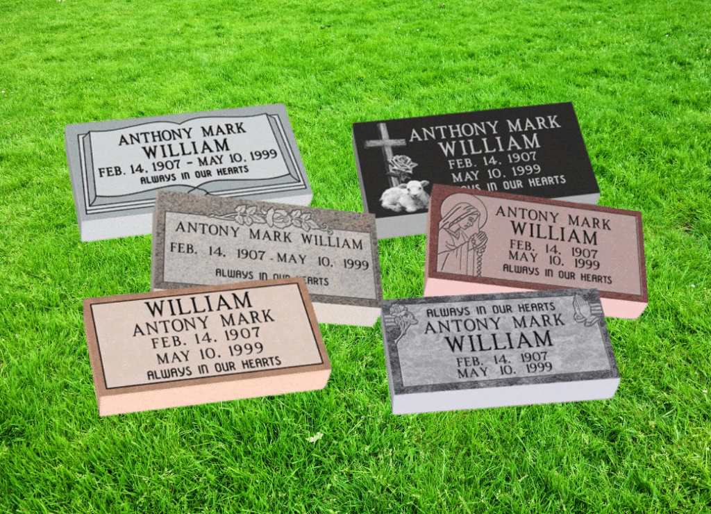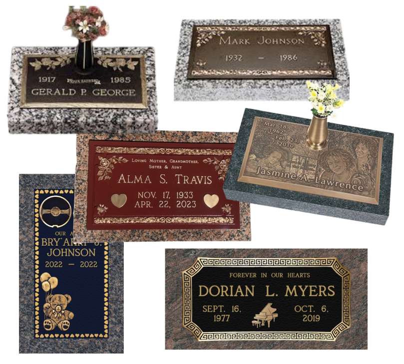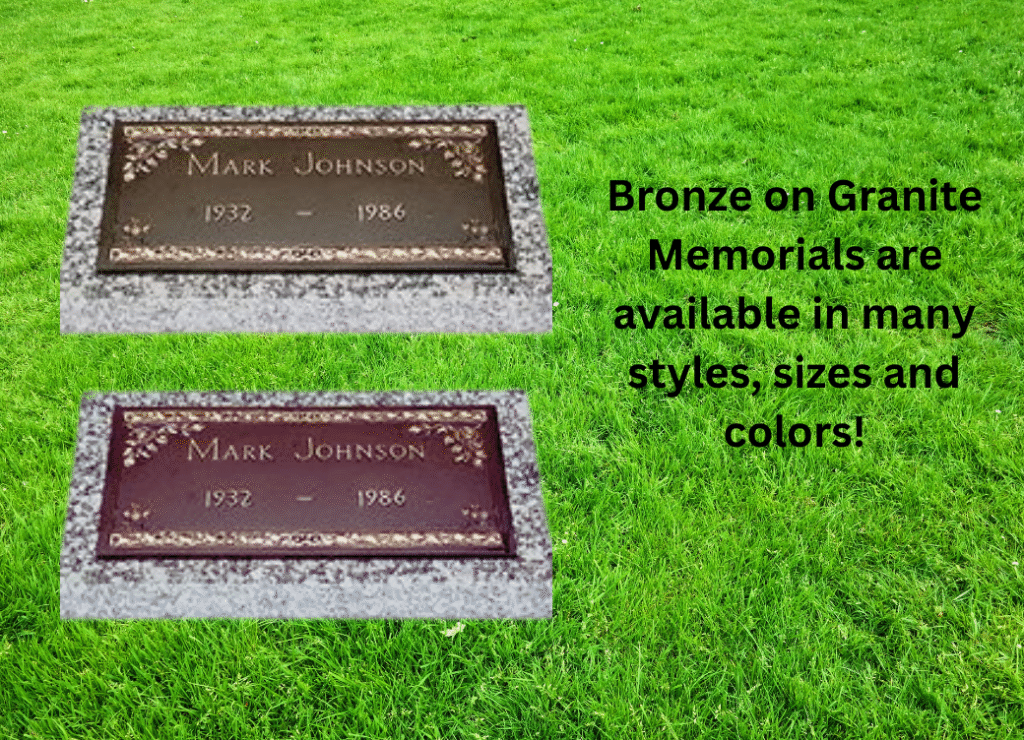Markers are available in many styles, designs, sizes and colors. Carved granite is the most widely used along with Bronze on Granite memorials. They made be made with cameos as well as laser-etched pictures. Allow us help you create the perfect design for your loved one!