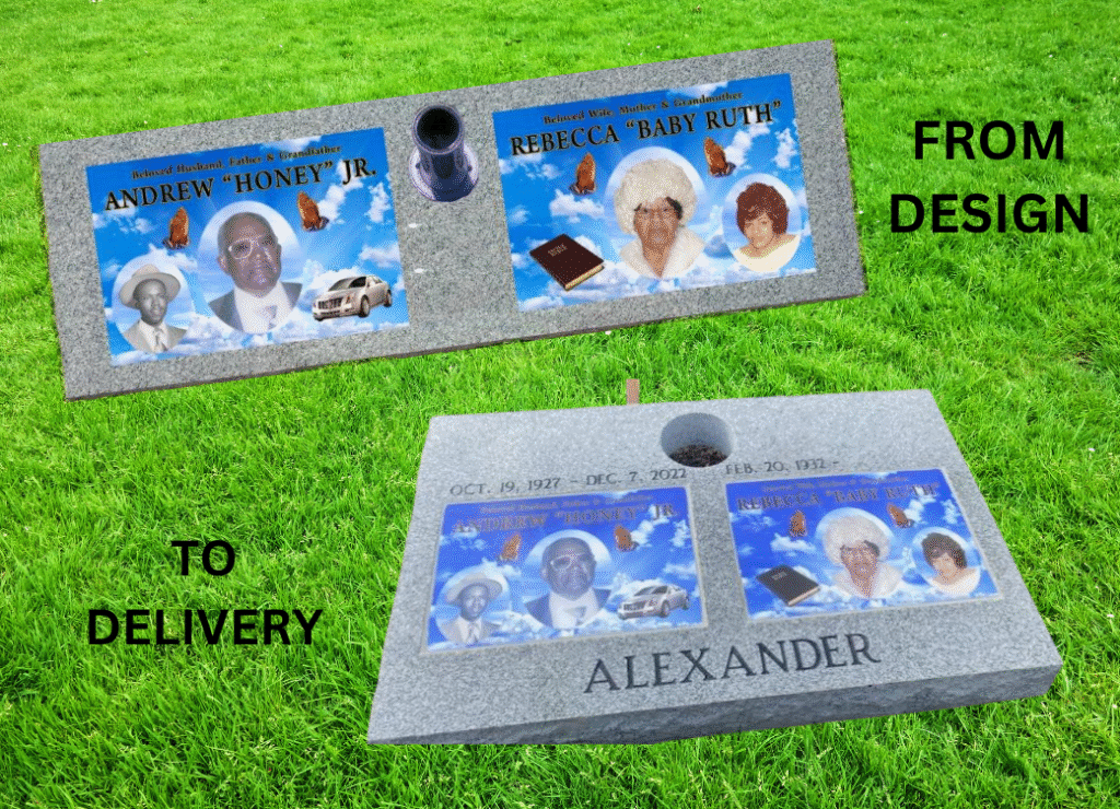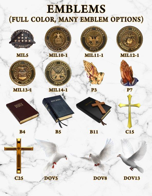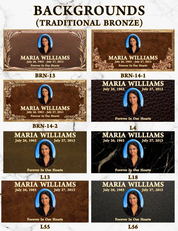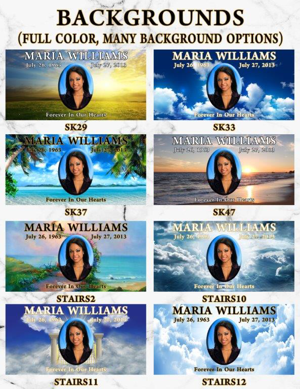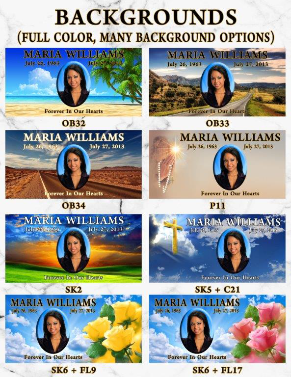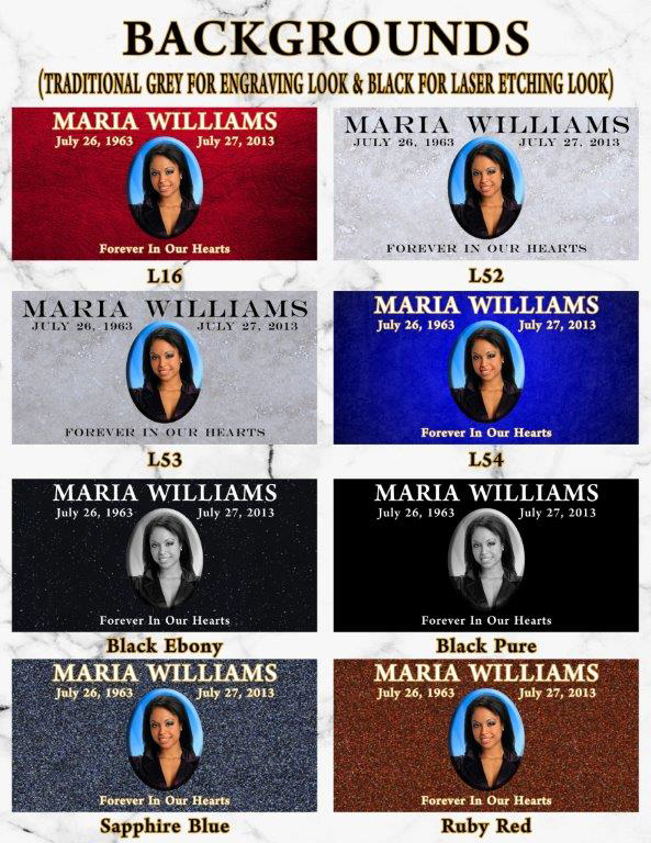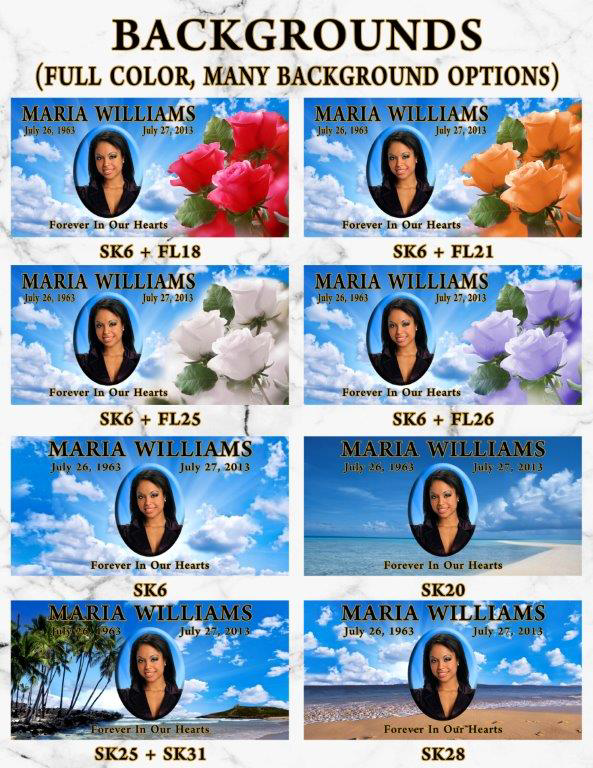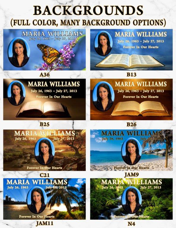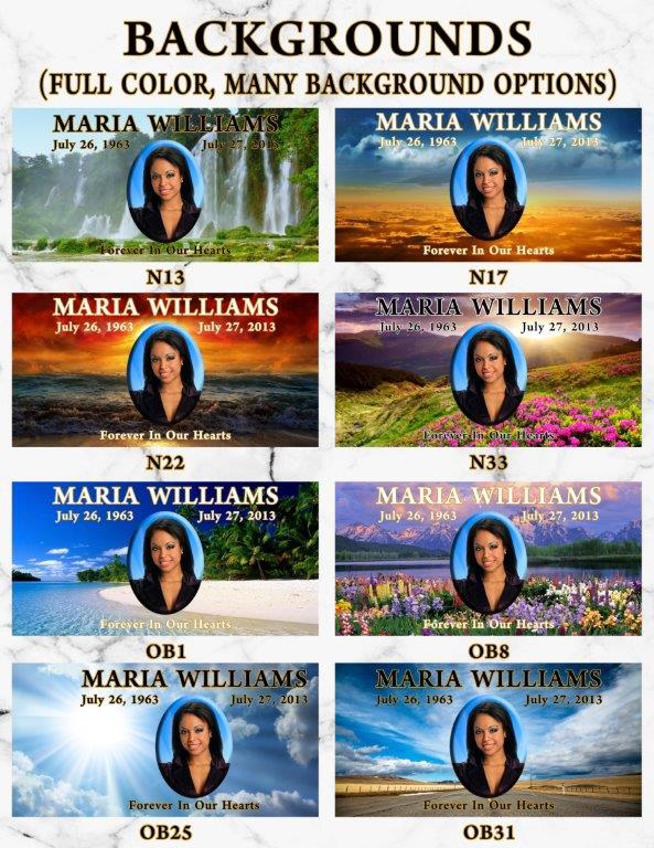 Our Vibrant Memorial products allow for greater personalization. There are no limits placed on text styles or sizes, unlimited background ideas, and no additional fee for emblems or wording!